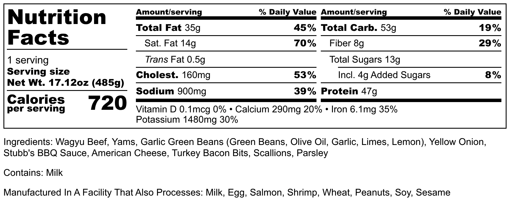 Ingredients: Wagyu Beef, Yams, Garlic Green Beans (Green Beans, Olive Oil, Garlic, Limes, Lemon), yellow onion, Stubb’s BBQ Sauce, American Cheese, Turkey Bacon Bits, Scallions, Parsley