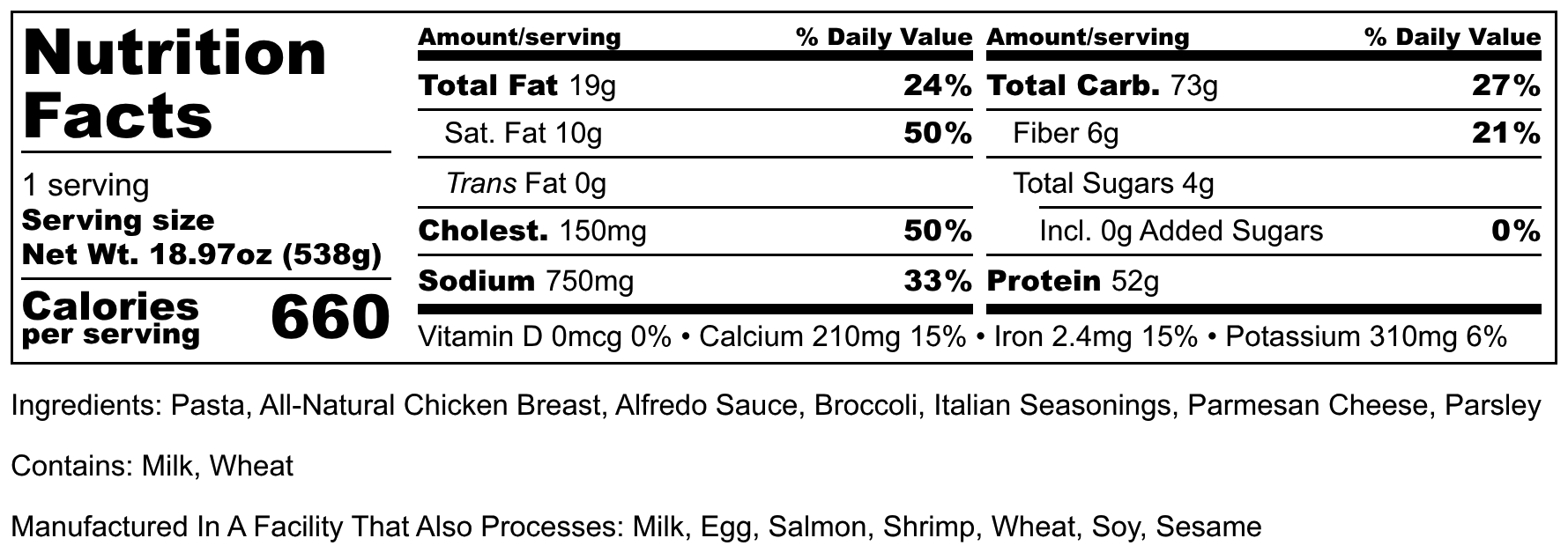 Ingredients: Pasta, All-Natural Chicken Breast, Alfredo sauce, Broccoli, Italian Seasonings, Parmesan cheese, Parsley