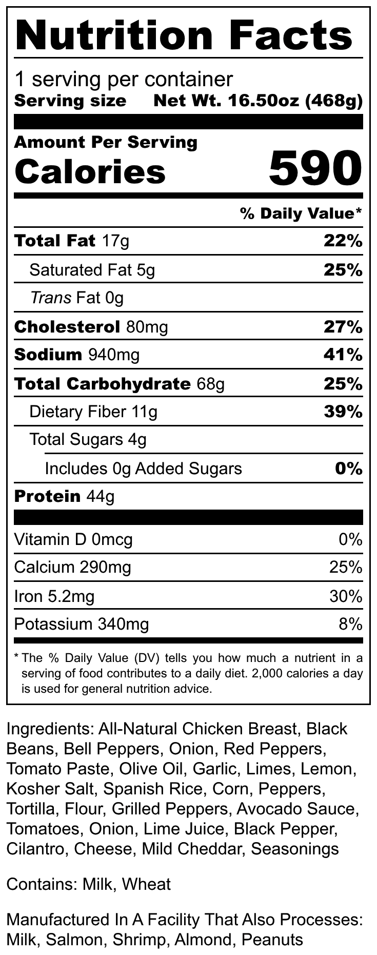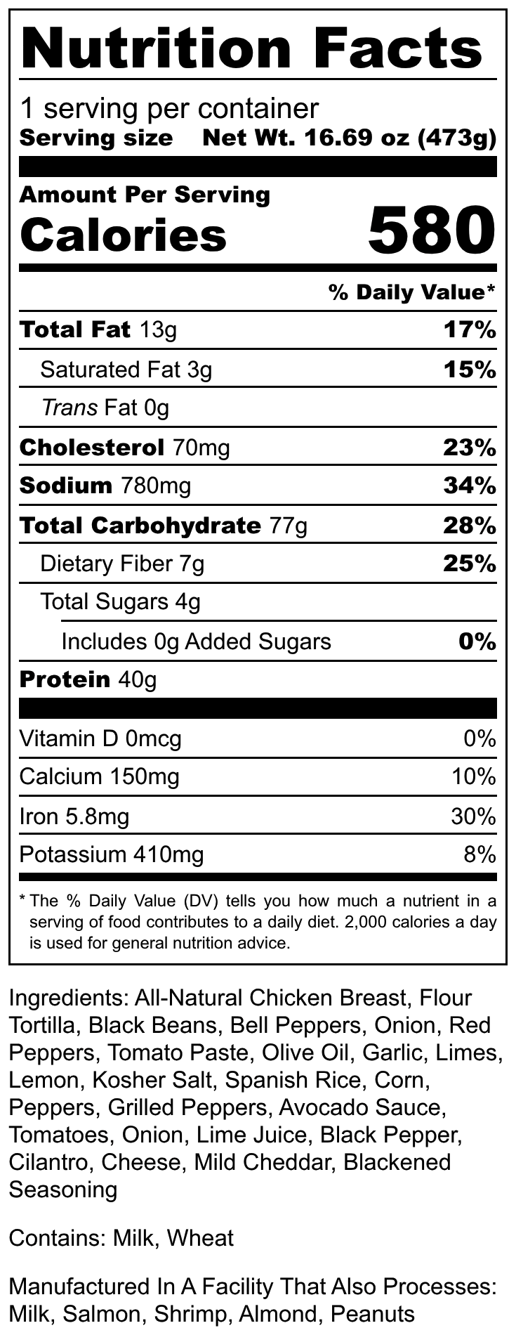 All-Natural Chicken Breast, Flour Tortilla, Black Beans, Bell Peppers, Onion, Red Peppers, Tomato Paste, Olive Oil, Garlic, Limes, Lemon, Kosher Salt, Spanish Rice, Corn, Peppers, Grilled Peppers, Avocado Sauce, Tomatoes, Onion, Lime Juice, Black Pepper, Cilantro, Cheese, Mild Cheddar, Blackened Seasoning