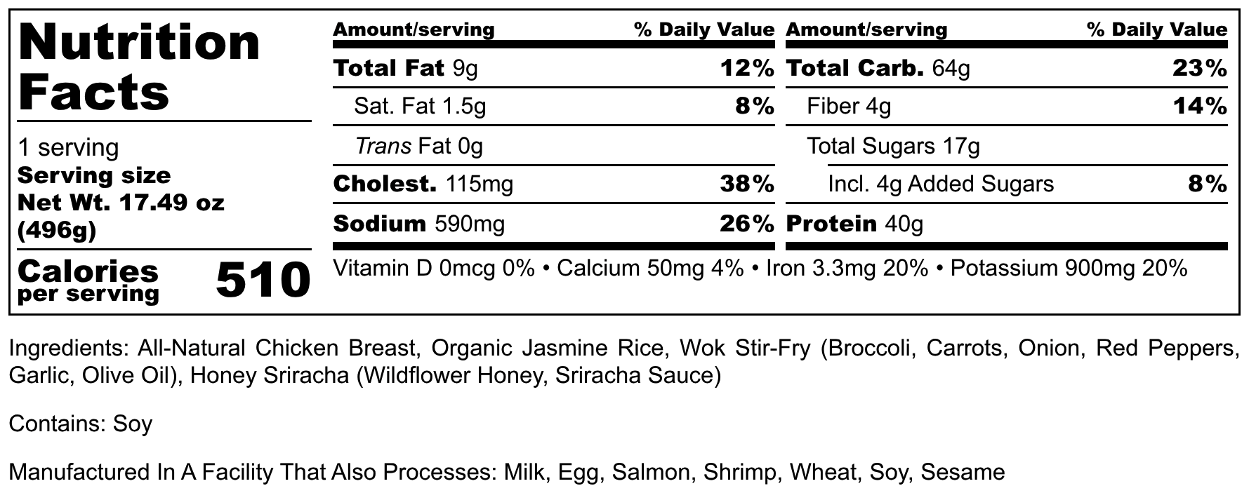 Ingredients: All-Natural Chicken Breast, Organic Jasmine Rice, Wok Stir-Fry (Broccoli, Carrots, Onion, Red Peppers, SOJO (Olive Oil, Garlic, Limes, Lemon, Soy Sauce)), Honey Sriracha (Wildflower honey, Sriracha Sauce)
