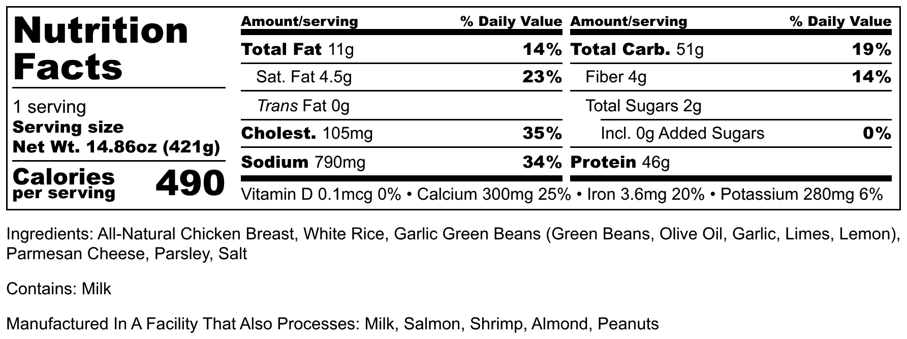 Ingredients: All-Natural Chicken Breast, White Rice, Garlic Green Beans (Green Beans, Olive Oil, Garlic, Limes, Lemon), Parmesan cheese, Parsley, salt