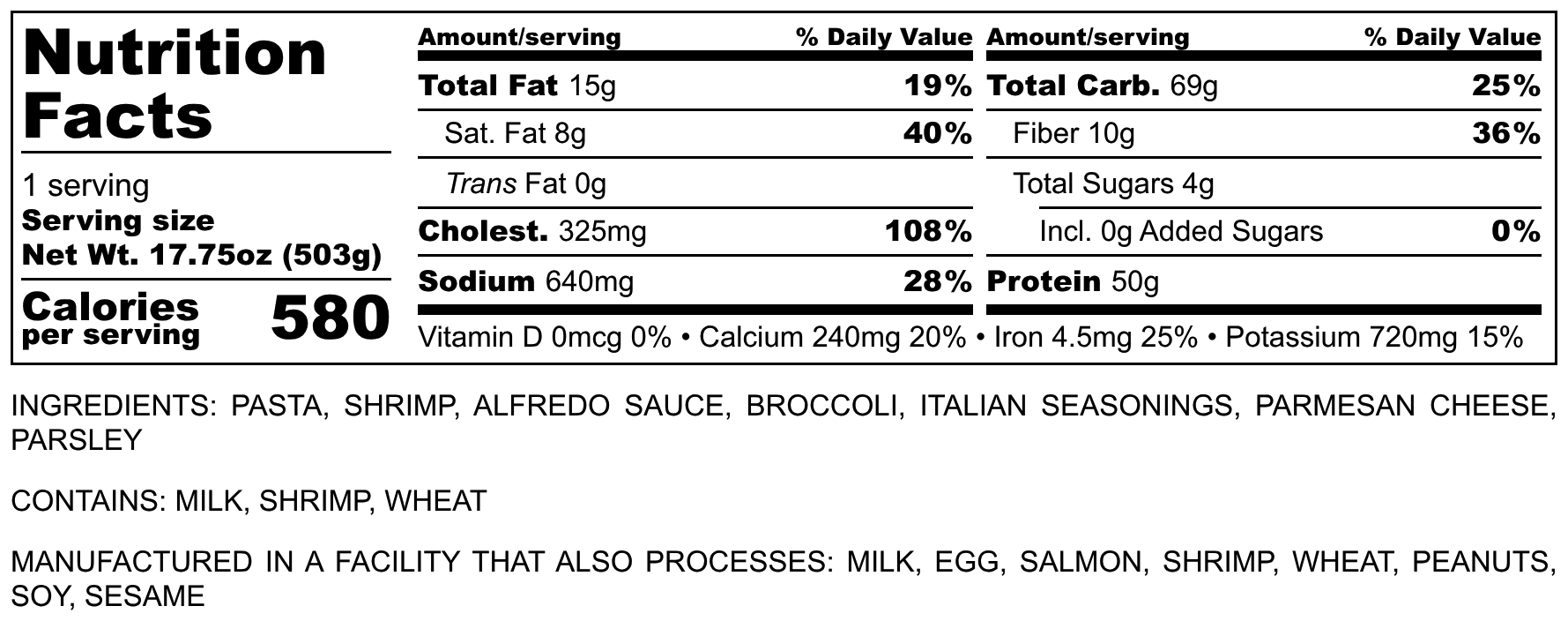Pasta, Shrimp, Alfredo sauce, Broccoli, Italian Seasonings, Parmesan cheese, Parsley