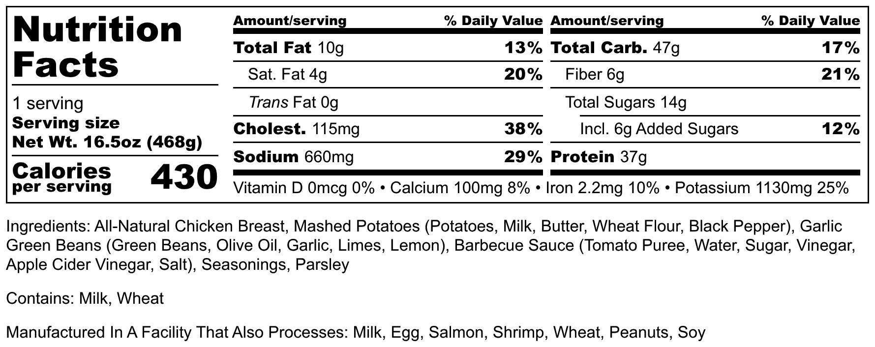 Ingredients: All-Natural Chicken Breast, Mashed Potatoes (Potatoes, Milk, Butter, Wheat flour, Black Pepper), Garlic Green Beans (Green Beans, Olive Oil, Garlic, Limes, Lemon), Barbecue Sauce (tomato puree, water, sugar, vinegar, apple cider vinegar, salt), Seasonings, Parsley