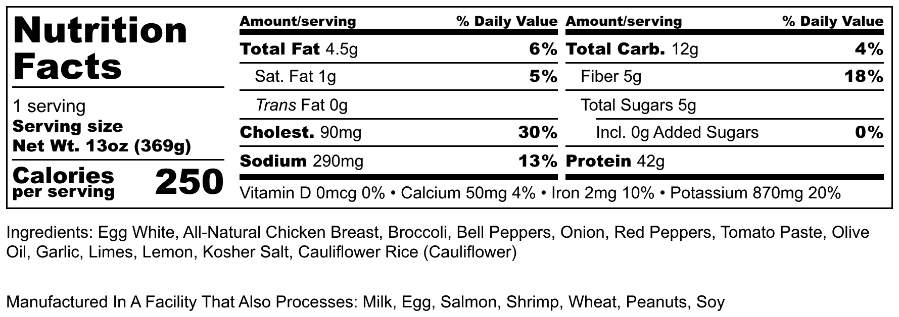 Ingredients: Egg White, All-Natural Chicken Breast, Broccoli, Bell Peppers, Onion, Red Peppers, Tomato Paste, Olive Oil, Garlic, Limes, Lemon, Kosher Salt, Cauliflower Rice (Cauliflower)