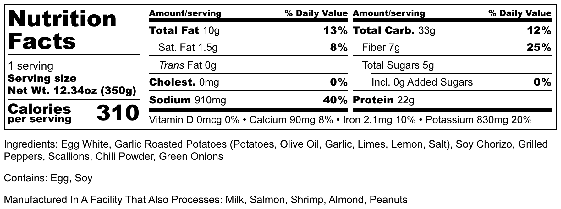 Ingredients: Egg White, Garlic Roasted Potatoes (Potatoes, Olive Oil, Garlic, Limes, Lemon, salt), Soy Chorizo, Grilled Peppers, Scallions, Chili Powder, Green Onions