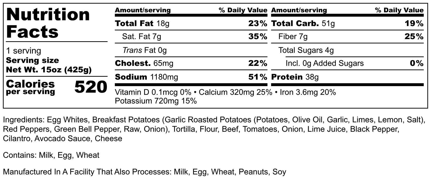 Ingredients: Egg Whites, Breakfast Potatoes (Garlic Roasted Potatoes (Potatoes, Olive Oil, Garlic, Limes, Lemon, salt), Red Peppers, Green Bell Pepper, raw, Onion), Tortilla, Flour, Beef, Tomatoes, Onion, Lime Juice, Black Pepper, Cilantro, Avocado Sauce, Cheese
