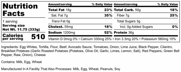 Ingredients: Egg Whites, Tortilla, Flour, Beef, Avocado Sauce, Tomatoes, Onion, Lime Juice, Black Pepper, Cilantro, Breakfast Potatoes (Garlic Roasted Potatoes (Potatoes, Olive Oil, Garlic, Limes, Lemon, salt), Red Peppers, Green Bell Pepper, raw, Onion), Cheese
