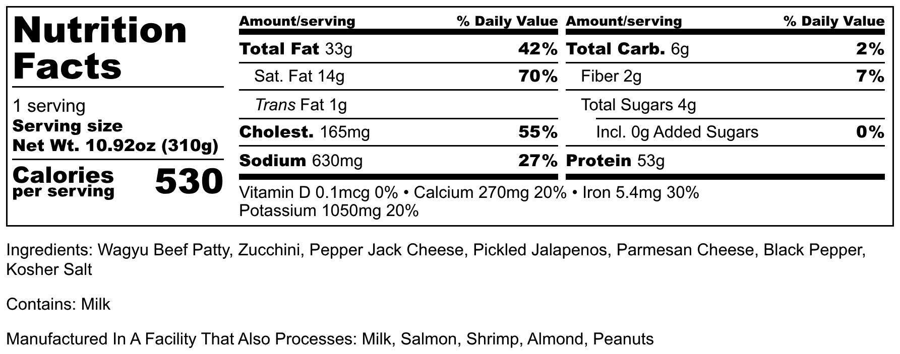 Ingredients: Wagyu Beef, Zucchini, Pepper Jack Cheese, Pickled Jalapeños, Parmesan cheese, Olive Oil, Black Pepper, Kosher Salt