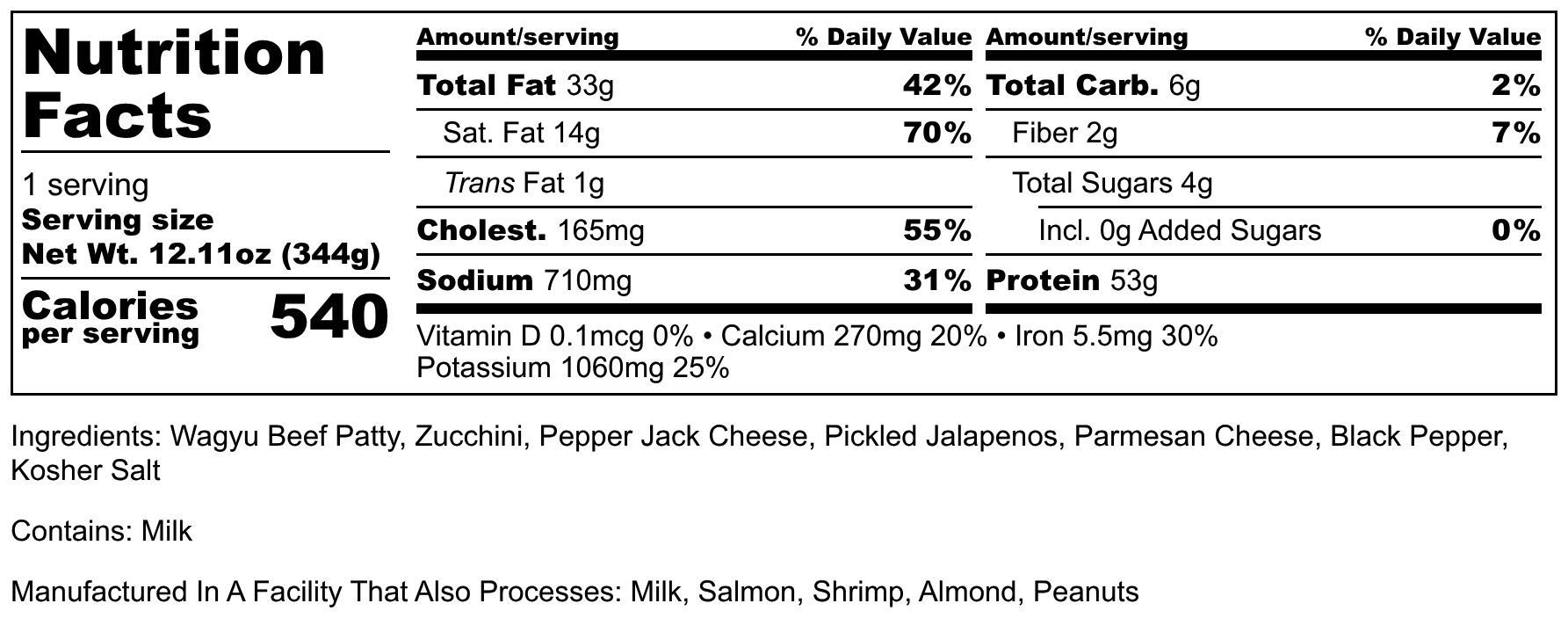 Ingredients: Wagyu Beef Patty, Zucchini, Pepper Jack Cheese, Pickled Jalapenos, Parmesan cheese, Black Pepper, Kosher Salt