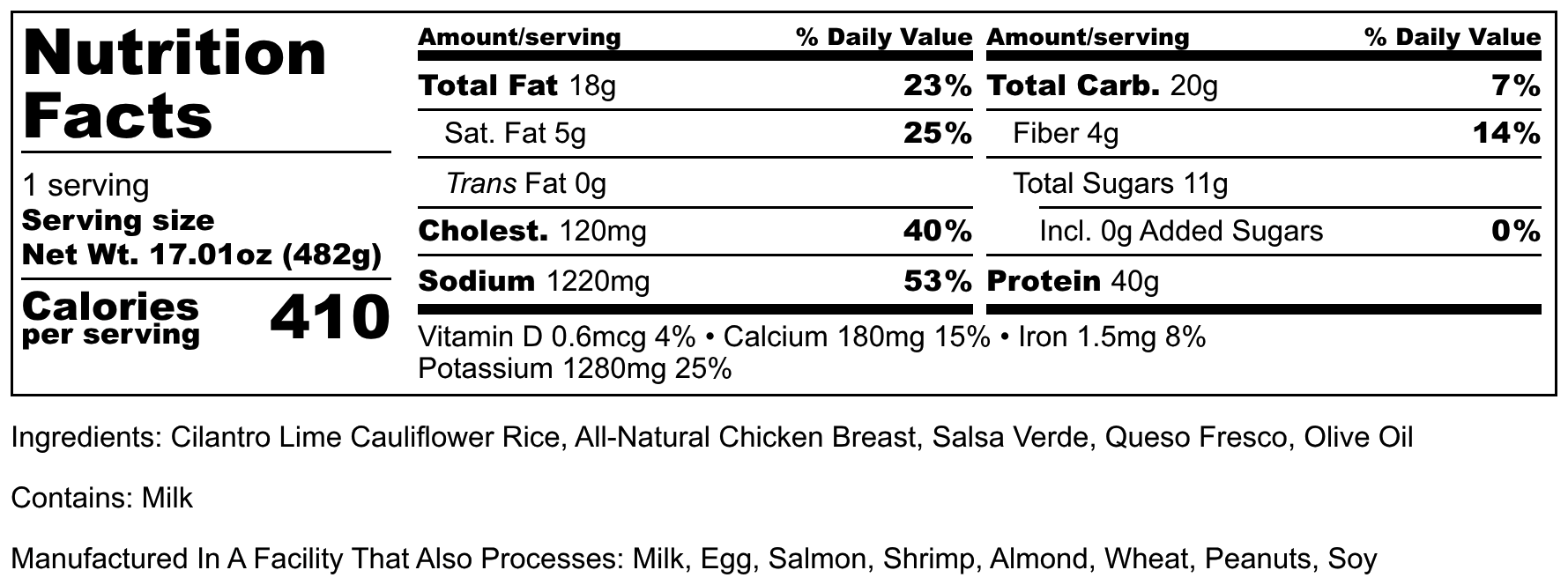 Cilantro Lime Cauliflower Rice, All-Natural Chicken Breast, Salsa Verde, queso fresco, Olive Oil