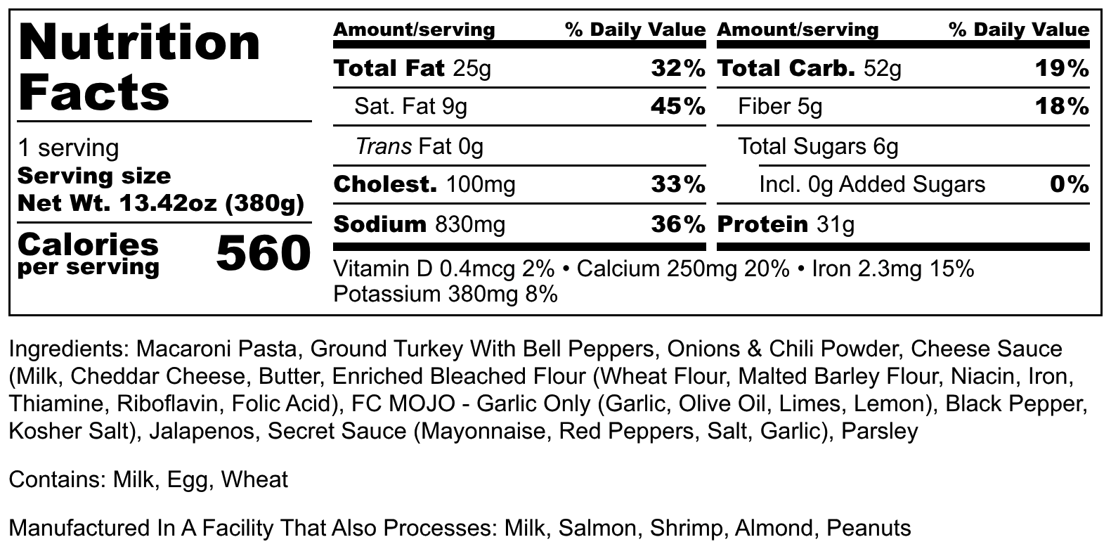 Ingredients: Macaroni Pasta, Ground Turkey with Bell Peppers, Onions & Chili Powder, Cheese Sauce (Milk, Cheddar Cheese, Butter, Enriched Bleached Flour (Wheat Flour, Malted Barley Flour, Niacin, Iron, Thiamine, Riboflavin, Folic Acid), FC MOJO – Garlic Only (Garlic, Olive Oil, Limes, Lemon), Black Pepper, Kosher Salt), Jalapenos, Secret Sauce (Mayonnaise, Red Peppers, Salt, garlic), Parsley