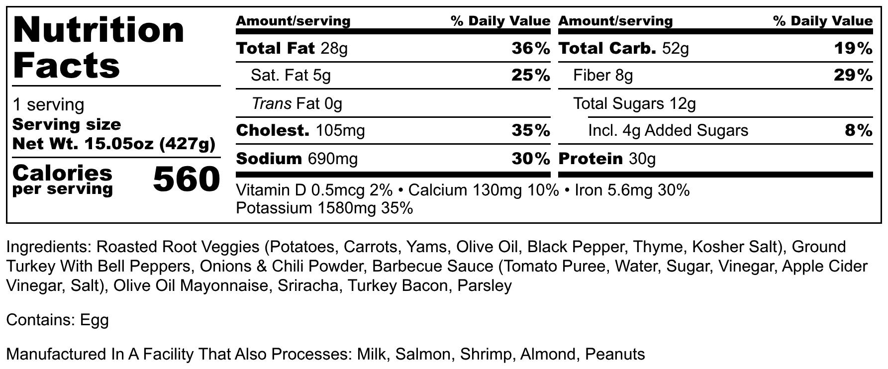 ROASTED ROOT VEGGIES (POTATOES, CARROTS, YAMS, OLIVE OIL, BLACK PEPPER, THYME, KOSHER SALT), FC SIGNATURE TURKEY (GROUND TURKEY, BELL PEPPERS, ONION, RED PEPPERS, TOMATO PASTE, OLIVE OIL, GARLIC, LIMES, LEMON, KOSHER SALT, CHILI POWDER), BARBECUE SAUCE (TOMATO PUREE, WATER, SUGAR, VINEGAR, APPLE CIDER VINEGAR, SALT), OLIVE OIL MAYONNAISE, SRIRACHA, TURKEY BACON