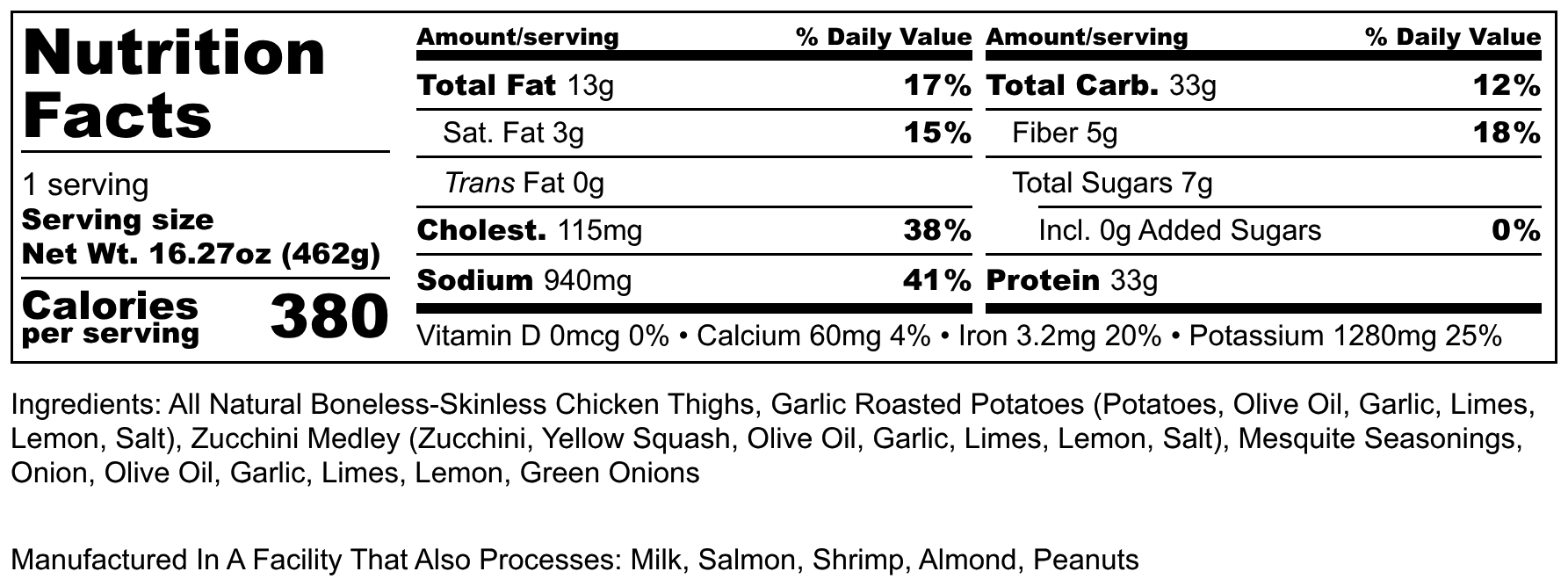 All Natural Boneless-Skinless Chicken Thighs, Garlic Roasted Potatoes (Potatoes, Olive Oil, Garlic, Limes, Lemon, salt), Zucchini Medley (Zucchini, Yellow Squash, Olive Oil, Garlic, Limes, Lemon, salt), Mesquite Seasonings, Onion, Olive Oil, Garlic, Limes, Lemon, Green Onions