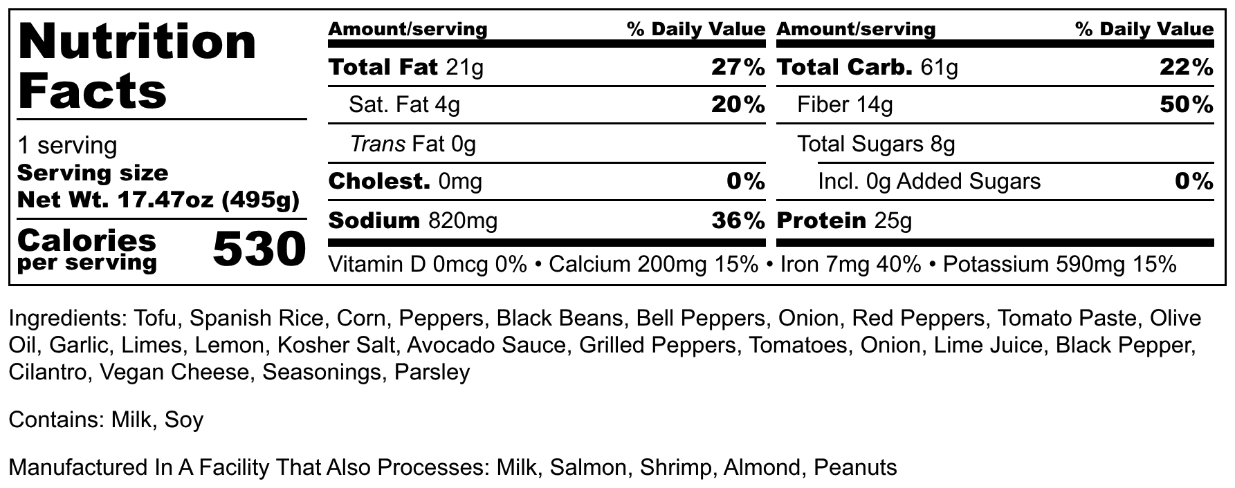 Ingredients: Tofu, Spanish Rice, Corn, Peppers, Black Beans, Bell Peppers, Onion, Red Peppers, Tomato Paste, Olive Oil, Garlic, Limes, Lemon, Kosher Salt, Avocado Sauce, Grilled Peppers, Tomatoes, Onion, Lime Juice, Black Pepper, Cilantro, Vegan Cheese, Seasonings, Parsley