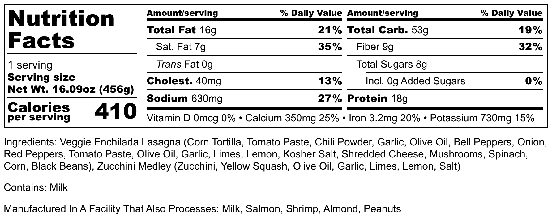 Ingredients: Veggie Enchilada Lasagna (Corn Tortilla, Tomato Paste, Chili Powder, Garlic, Olive Oil, Bell Peppers, Onion, Red Peppers, Tomato Paste, Olive Oil, Garlic, Limes, Lemon, Kosher Salt, Shredded Cheese, Mushrooms, Spinach, Corn, Black Beans), Zucchini Medley (Zucchini, Yellow Squash, Olive Oil, Garlic, Limes, Lemon, salt)