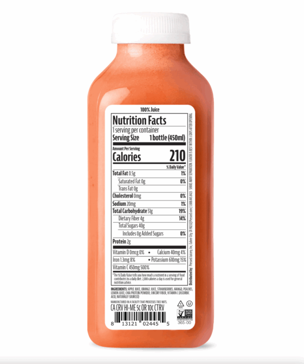INGREDIENTS: Apple Juice, Orange Juice, Strawberries, Mango, Peaches, Lemon Juice, Chia Protein Powder, Chicory Fiber, Vitamin C (Ascorbic Acid, Naturally Sourced)