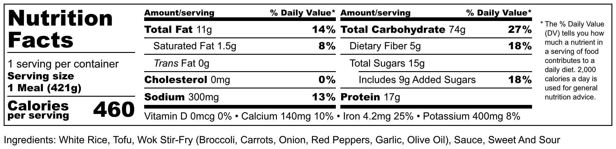 White Rice, Tofu, Wok Stir-Fry (Broccoli, Carrots, Onion, Red Peppers, Garlic, Olive Oil), Sauce, sweet and sour